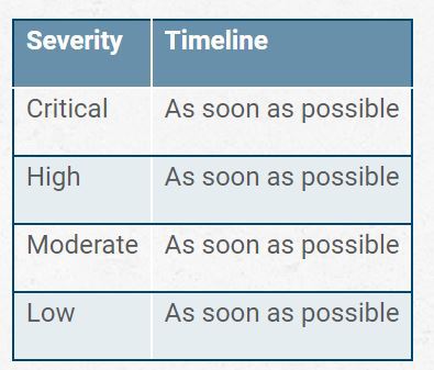 The problem is that even if you are setting an expectation that 95% of critical findings are to be patched within 10 days, leaving a buffer for more complex issues, the way such a rule is interpreted by most people is that patches do not need to be deployed until Day 9. In more mature organizations, they may take the form of patches being delayed to the next weekly patch window, still within the SLA. This is the psychological concept of “pinning,” where if someone hears that “high vulnerabilities should be patched in 30 days,” they are much more likely to deploy the patch on Day 28 than they are on Day 2. After all, on Day 2, there’s a lot of time before they have to do it. This means whatever the timeline says, all you’re doing is giving more time for attackers to target the issue. The correct table should look like this: