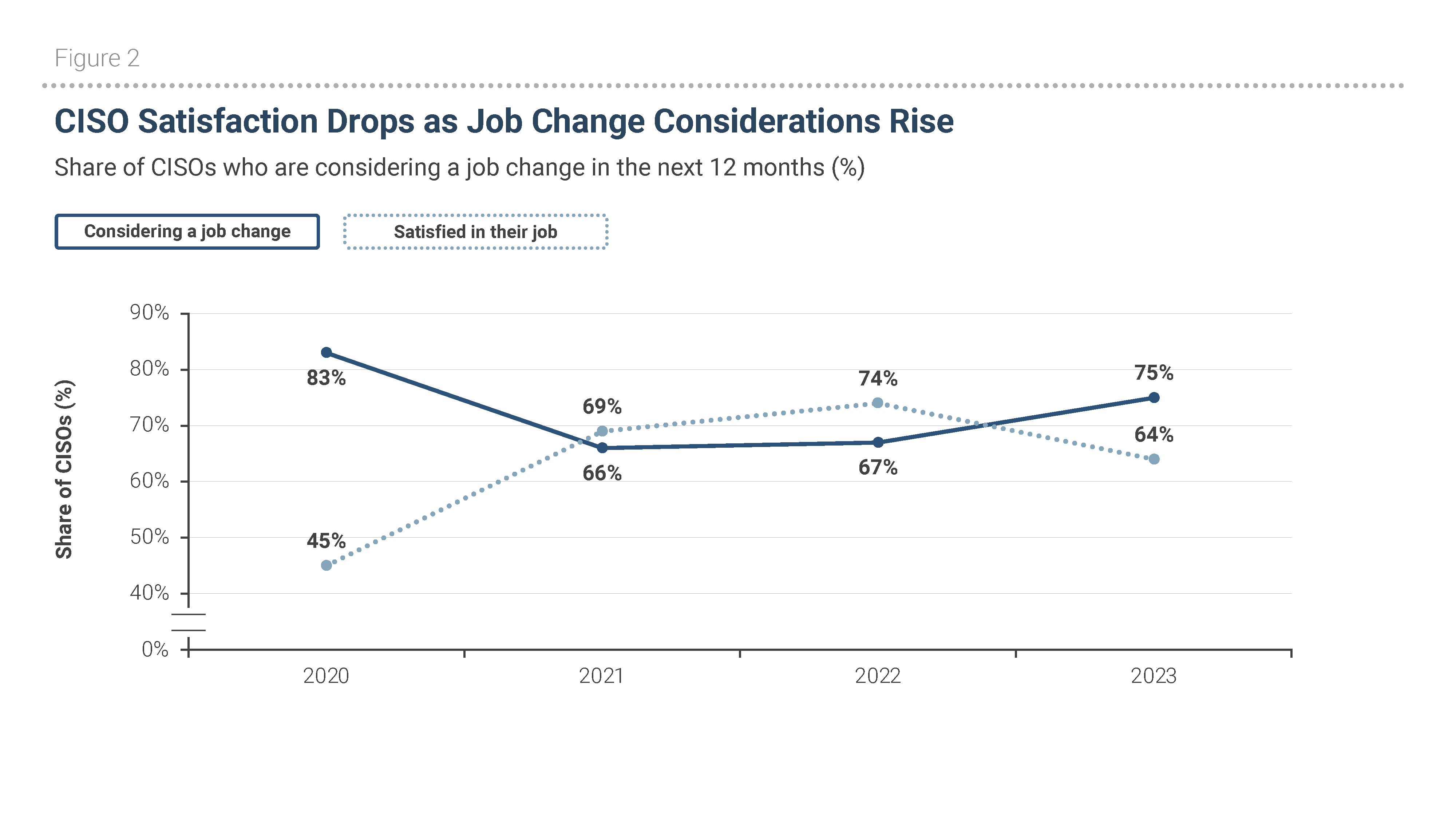 Over a multiyear period, a change in CISO satisfaction is accompanied by an inverse change in the percentage of CISOs considering a job change. Between 2022 and 2023, the share of CISOs satisfied in their job and company fell by 10 points to 64%. Meanwhile, the share that is open to a job change increased by 8 points to 75% (see Figure 2).